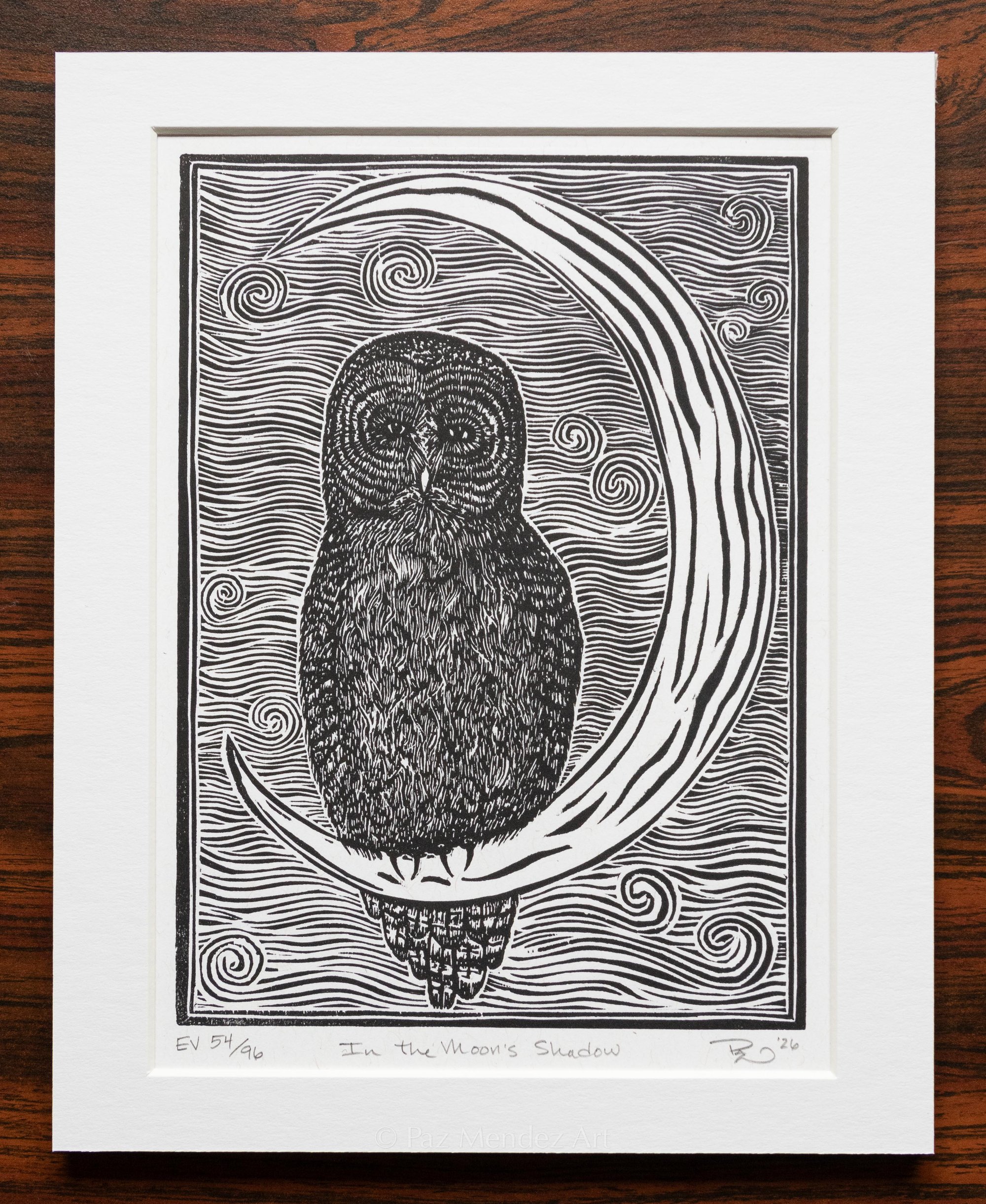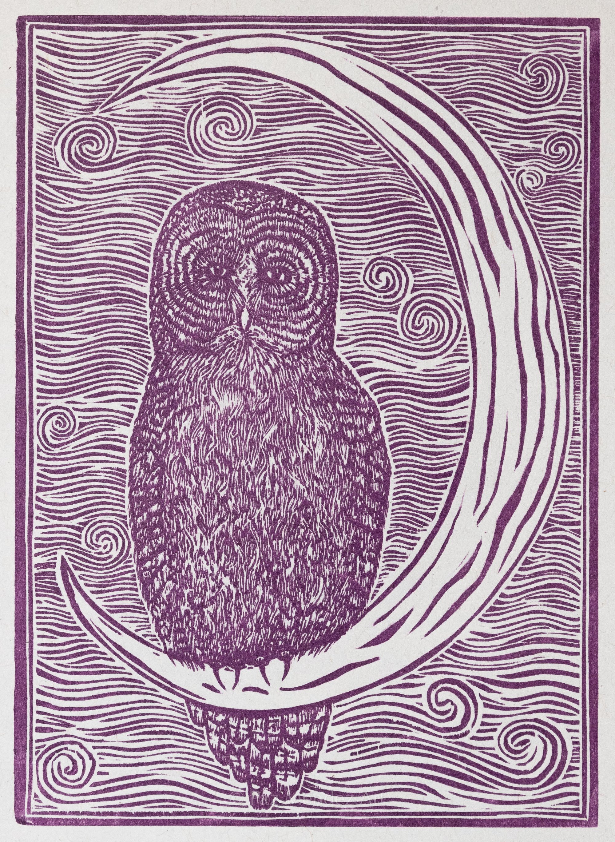 Inspired by great grey owls. I titled this woodcut print edition, 'In the Moon's Shadow', because once the moon rises, owls are right behind it. Silent watchers, following the moon through the night. (Fun fact: great grey owls have the nickname "ghost of the forest" because they're so elusive and hard to spot).