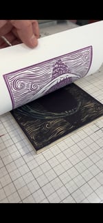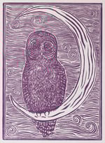 To make, 'In the Moon's Shadow', I started with a pencil sketch on a piece of Shina Plywood. Then I used my carving tools to cut each detail into the wood by hand. I found the feathers of the owl to be really fun to carve! I carved meditatively, in the moment, slowly letting the artwork come to life, one cut at a time. After I finished carving the block, I rolled oil-based ink onto the raised surface (above my cut marks), and printed the block onto fine art paper.