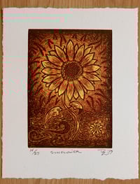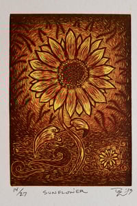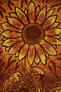 I created Sunflower by hand-carving my design into a block of linoleum. I printed it in five layers, using the same piece of lino. After printing the first layer of color, I carved more away off my lino block and printed the next layer. Repeating this process and reducing my lino down, one layer at a time. By the end of the process my lino block is destroyed and I can never reprint this design.